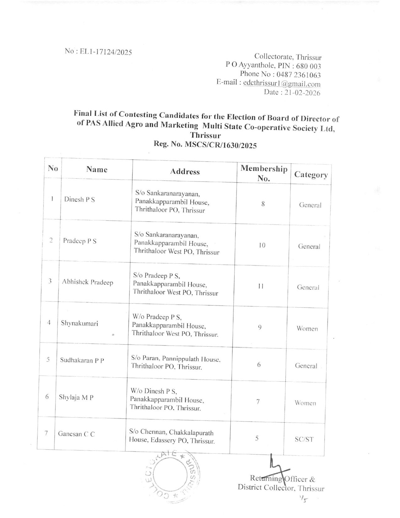 The Final List of Contesting Candidates for the Election of the Board of Directors of PAS Allied Agro and Marketing Multi State Co-operative Society Ltd, Thrissur (Reg. No. MSCS/CR/1630/2025), has been officially published from the Collectorate, Thrissur on 21-02-2026.